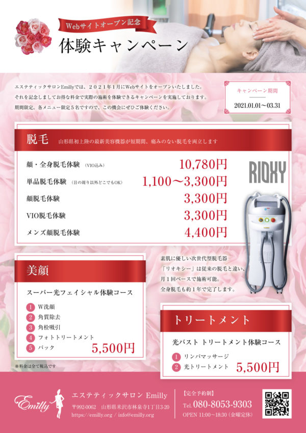 Topicsお知らせ Home > お知らせ > キャンペーン > Webサイトオープン記念キャンペーン 2021.01.20 Webサイトオープン記念キャンペーン エステティックサロンEmillyでは、2021年1月にWebサイトをオープンいたしました。 それを記念しましてお得な料金で実際の施術を体験できるキャンペーンを実施しております。 各メニュー限定5名ですので、この機会にぜひご体験ください。 カテゴリー一覧 キャンペーン ご案内 その他 月別アーカイブ 2024年12月 2024年1月 2023年12月 2023年4月 2022年12月 2022年11月 2022年9月 2022年7月 2022年4月 2021年11月 2021年4月 2021年3月 2021年1月 2020年12月