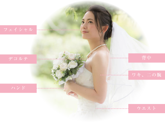 最高の日を最高の状態でお迎えするため、顔のお手入れ、背中、デコルテ、腕のトリートメントを行います。
